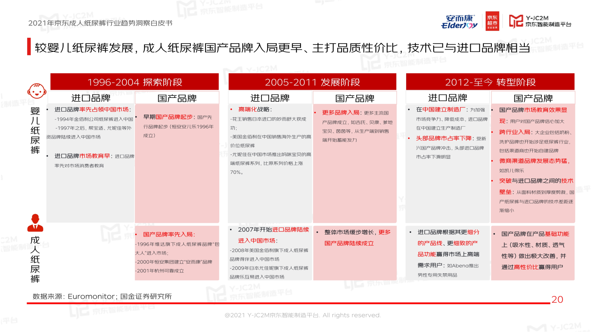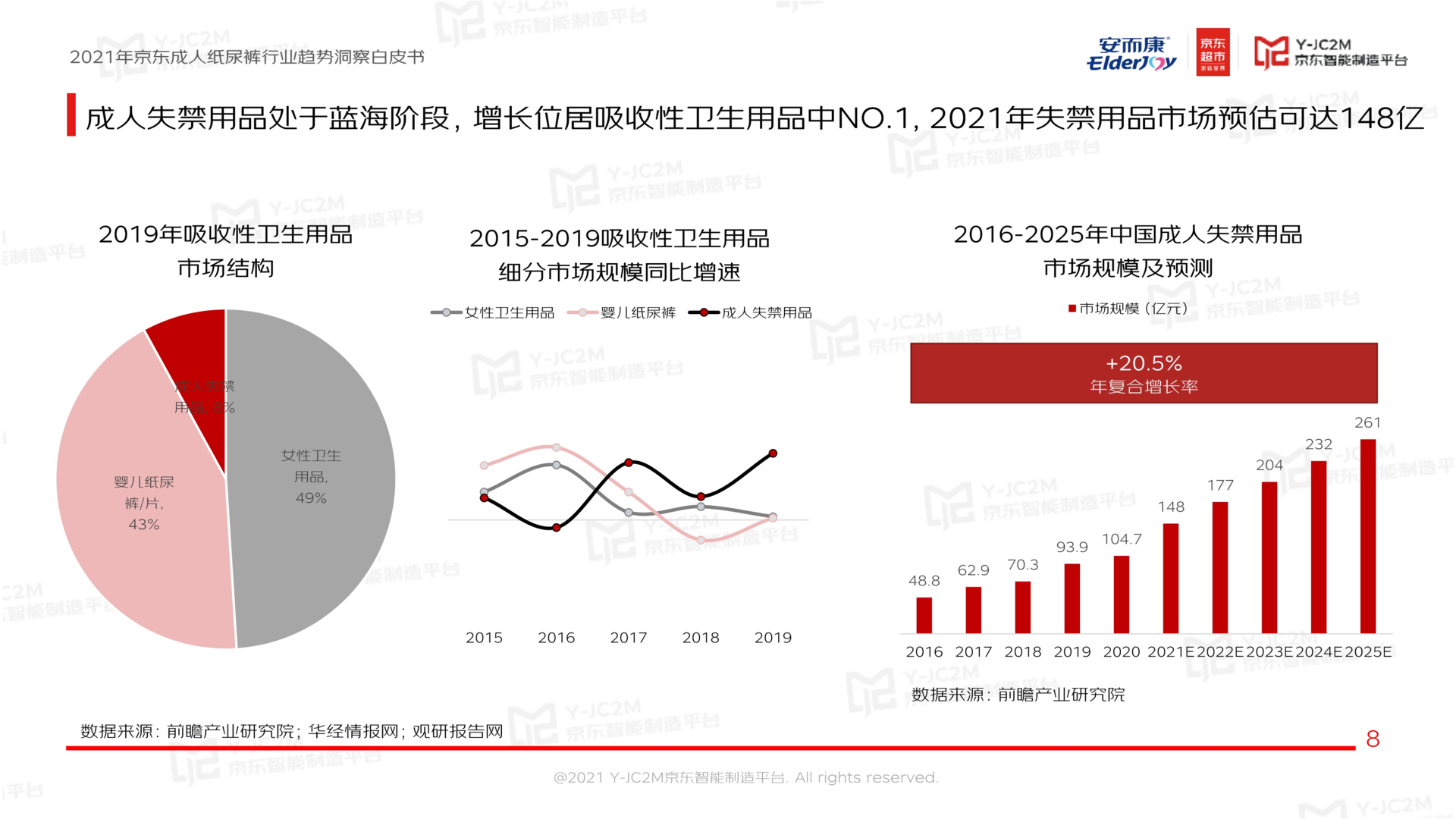 通过《2021年京东成人纸尿裤行业趋势洞察白皮书》的解读,我们不难发现,相较于历经多年发展、已接近或达到成熟期的婴儿护理用品和女性卫生用品行业,国内成人失禁用品行业现在刚刚开始步入成长通道,未来将成长为高增长赛道。综合消费升级趋势下的市场扩容、消费者教育后品牌认知提升等因素的作用,同时伴随养老服务制度在我国的完善,以及成人失禁护理相关福利政策的陆续出台,未来我国成人失禁用品机构渠道与个人需求增长将不断提速,而以尊龙时凯集团旗下安而康品牌为代表的国货更将有望凭借产品和先发优势继续领跑。